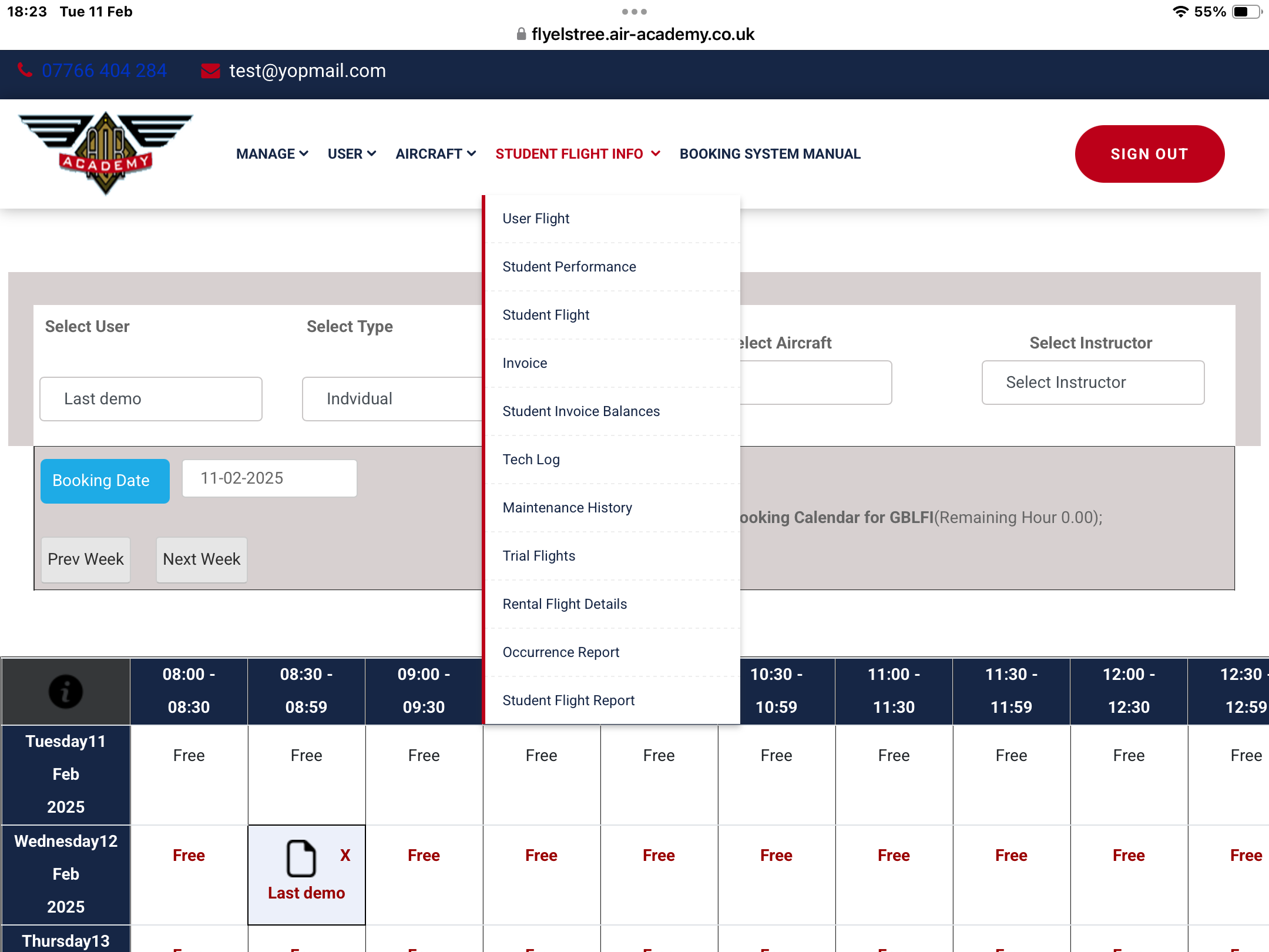 Aircraft Booking List- all bookins are listed here- you can filter bookings by student,Instructor, date range. can send list to student and instructor